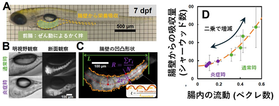 図1. ゼブラフィッシュ幼生(モデル生物:生命現象を研究するために選ばれた共通の生物)の通常時(図1A)と腸炎症誘発時における腸の形状計測(図1B・C)と腸運動による腸内の流動性ペクレ数(腸の活発度)と腸壁から吸収されたグルコースの吸収量シャーウッド数(栄養吸収度)との関係(図1D)。栄養吸収度は腸内流動性の二乗に比例して増加する関係を定量的に解明。